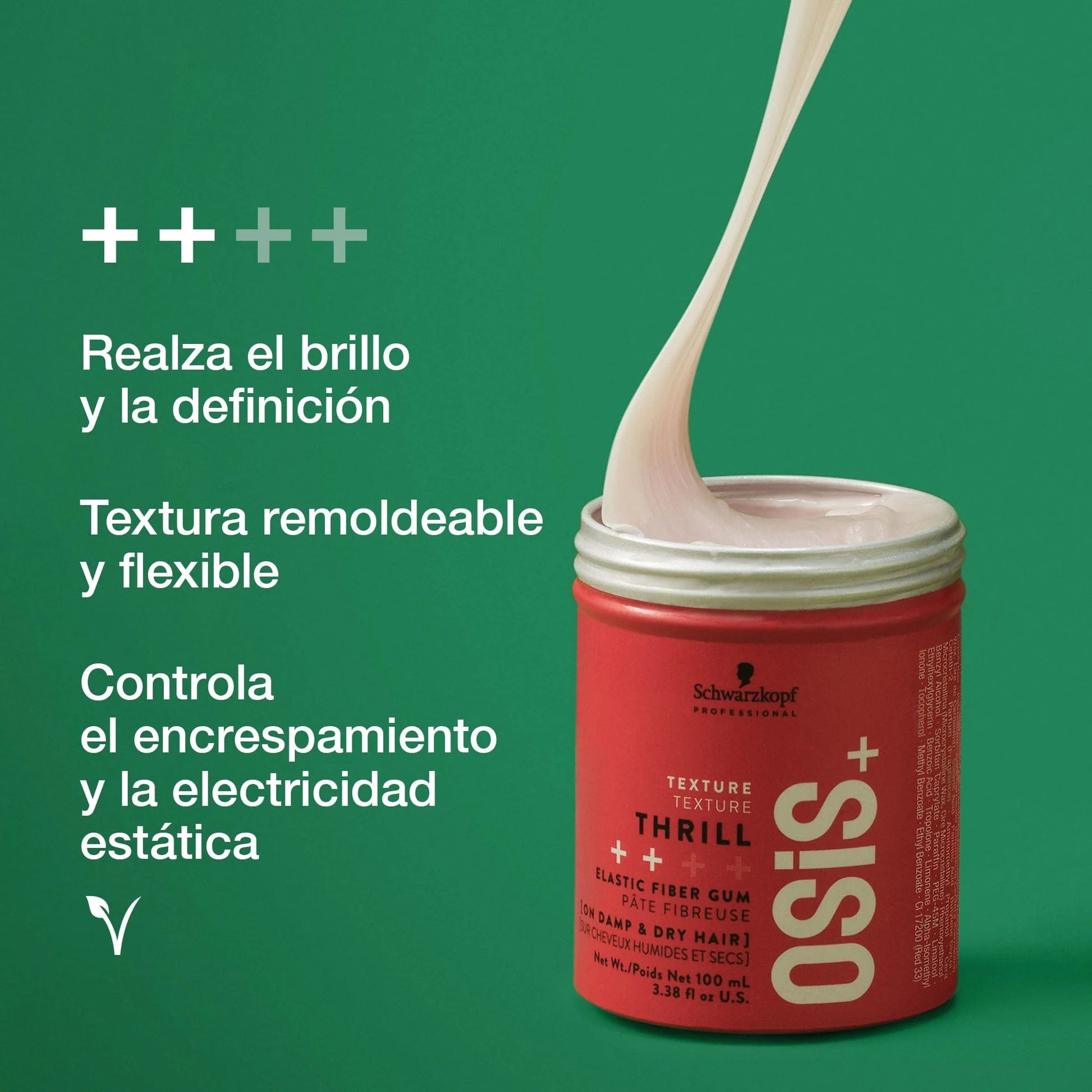 OSiS Thrill, que ha sido formulada para acentuar cualquier textura del cabello, es una goma fibrosa elástica de fijación media que crea una separación remoldeable y mejora el brillo mientras reduce el encrespamiento y combate la electricidad estática.